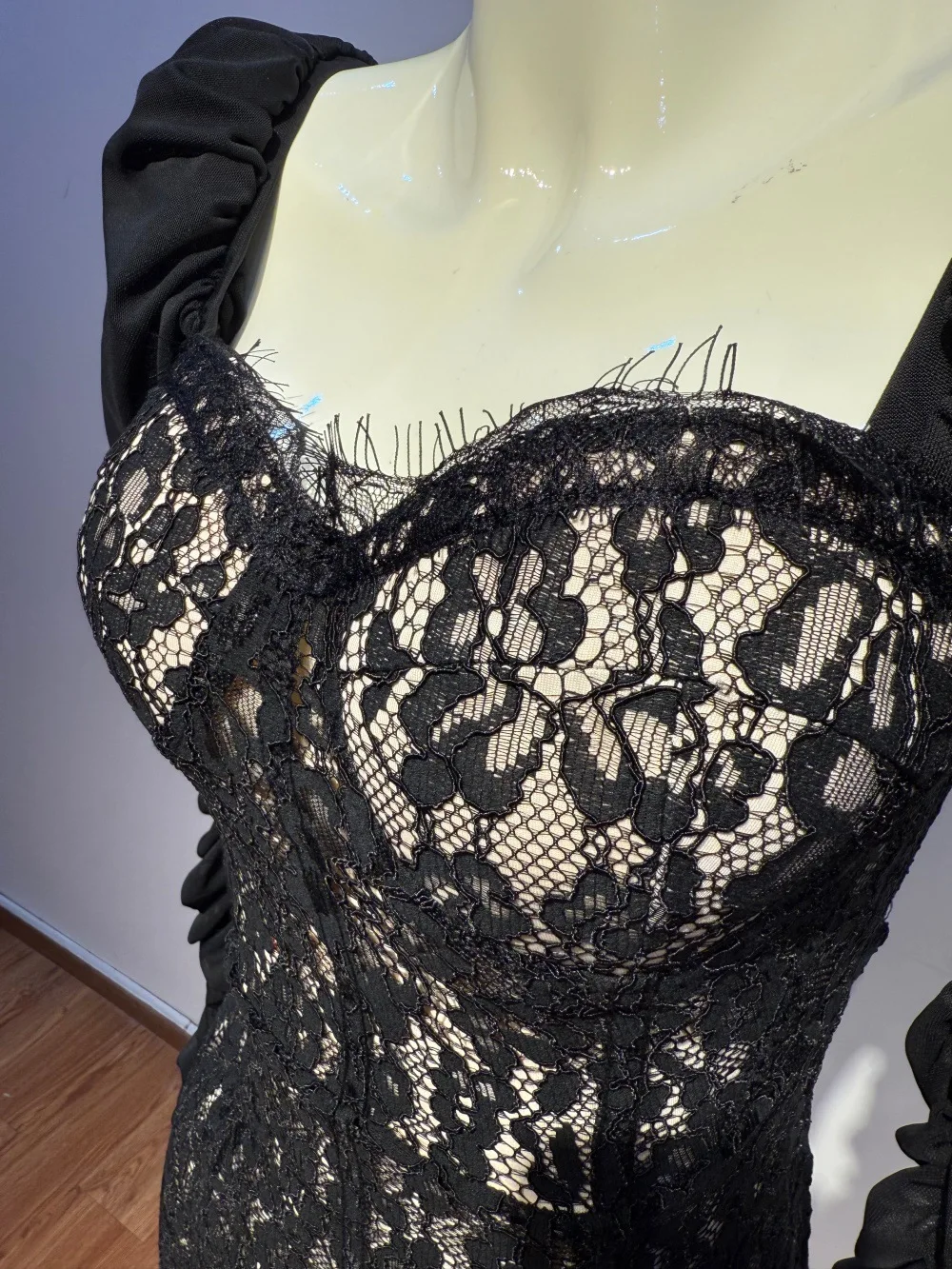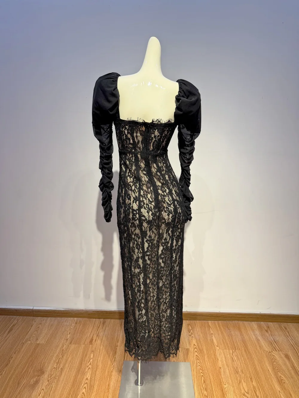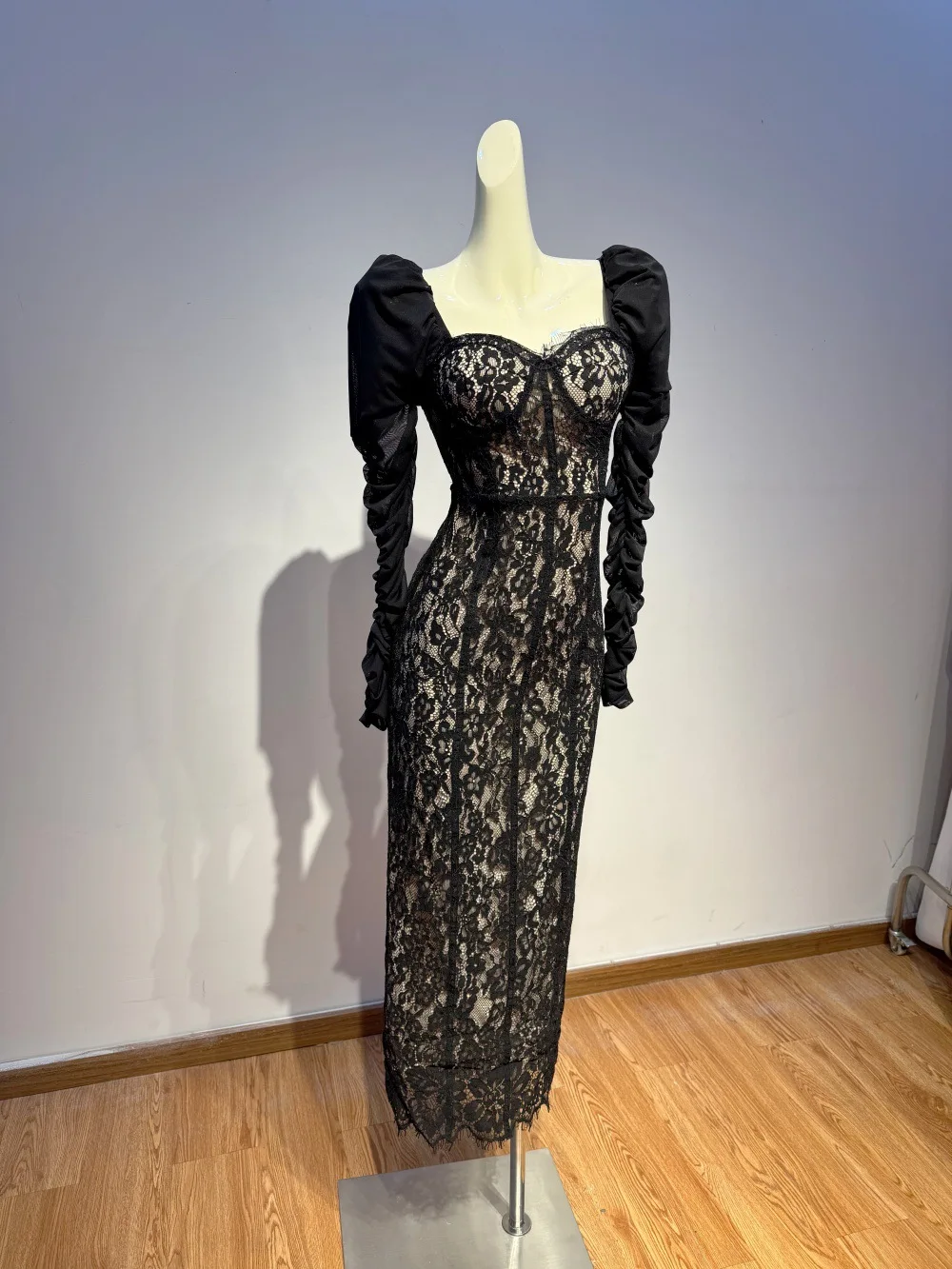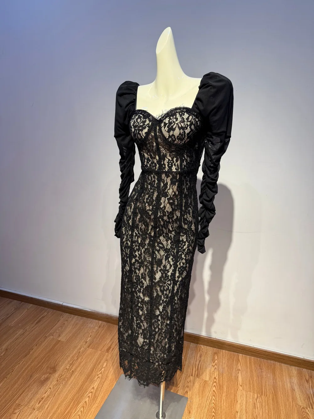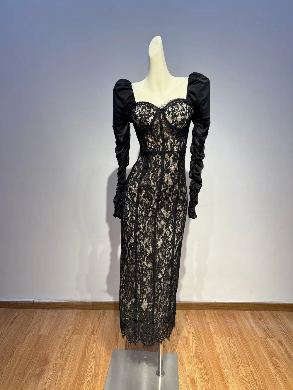 Bettergirl High-end Floral Lace Black Sexy Long Dress square Collar Pleated Long Sleeve Formal Dress